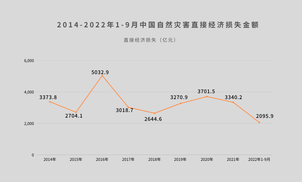 自然灾害不止导致人们受灾、死亡或失踪,也让许多家庭失去了重要的经济来源或者财产。根据数据显示,2014-2021年我国自然灾害直接经济损失都在2500亿元以上,2022年1-9月中国自然灾害直接经济经济损失金额为2095.9亿元。