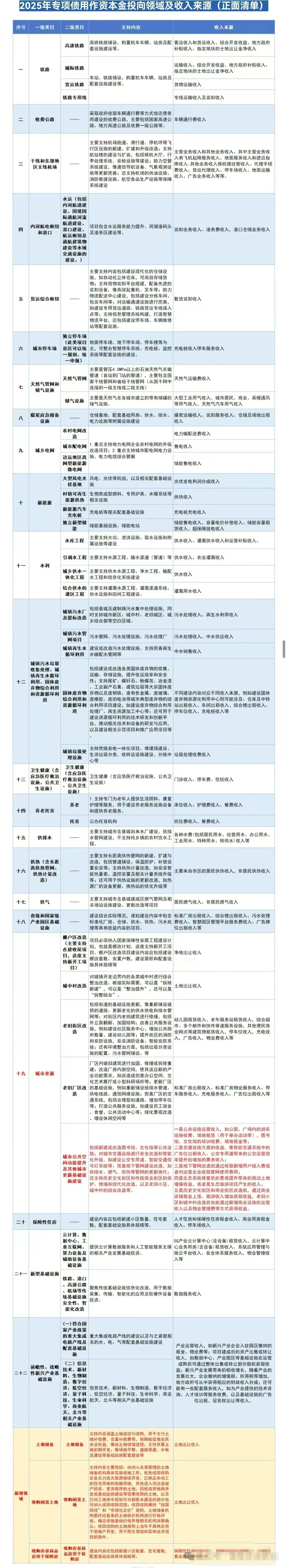 建议收藏!2025年专项债用作资本金投向领域及收入来源(正面清单)