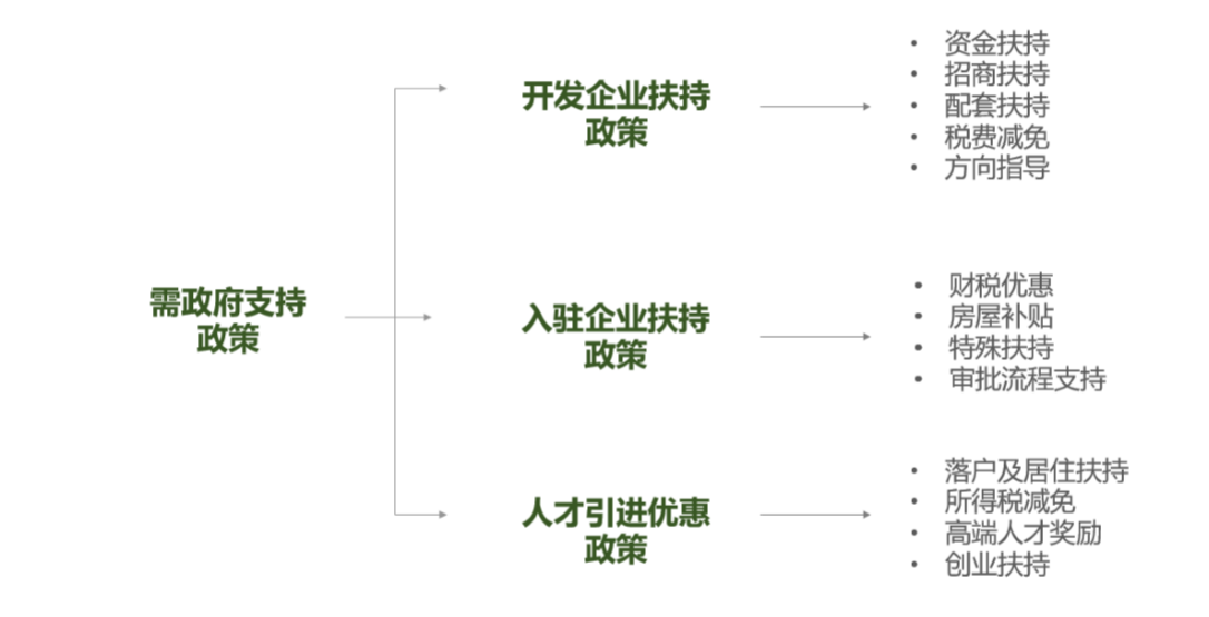 需政府支持政策:产业园区的开发,政策支持是非常重要的因素,因此开发商需要与政府协商,获取优惠政策优惠政策主要体现在针对开发企业、入驻企业及人才引进各方面提供相关扶持政策。